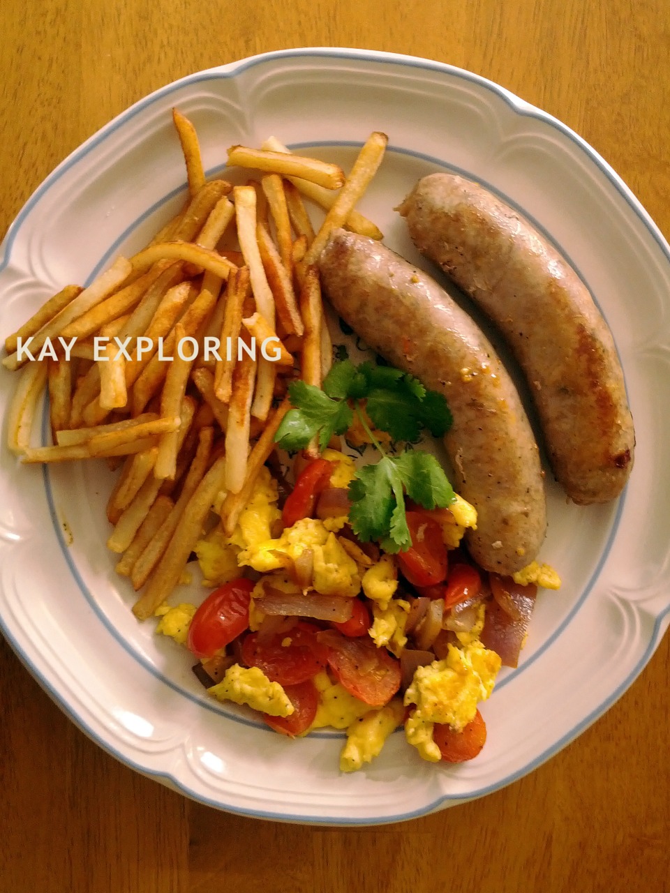 Sweet sausage from Main Street Market in Manayunk, Philadelphia. Baked shoe string potatoes (originally frozen). Egg scramble with sauteed red onion and grape tomatoes.