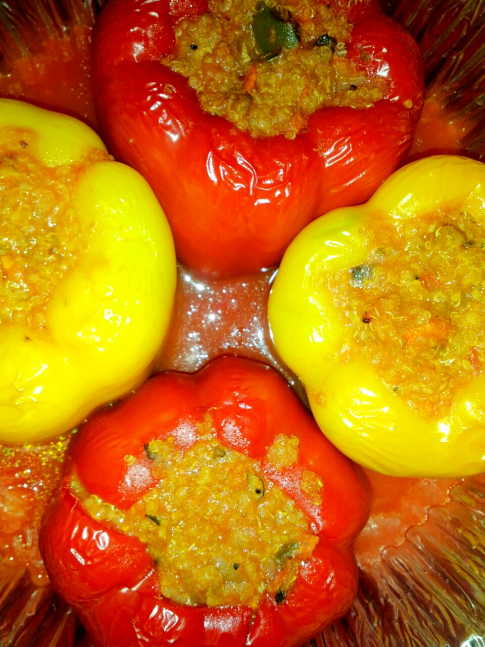 Quinoa, veggie and spicy poultry sausage stuffed peppers.