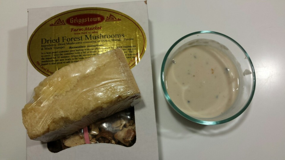 While it wasn’t fancy, hard or time-consuming (scoff!! lol), I did want to dress up my CCoMS. And I did. I busted out milk, fancy dried forest mushrooms and fresh parmesan cheese.