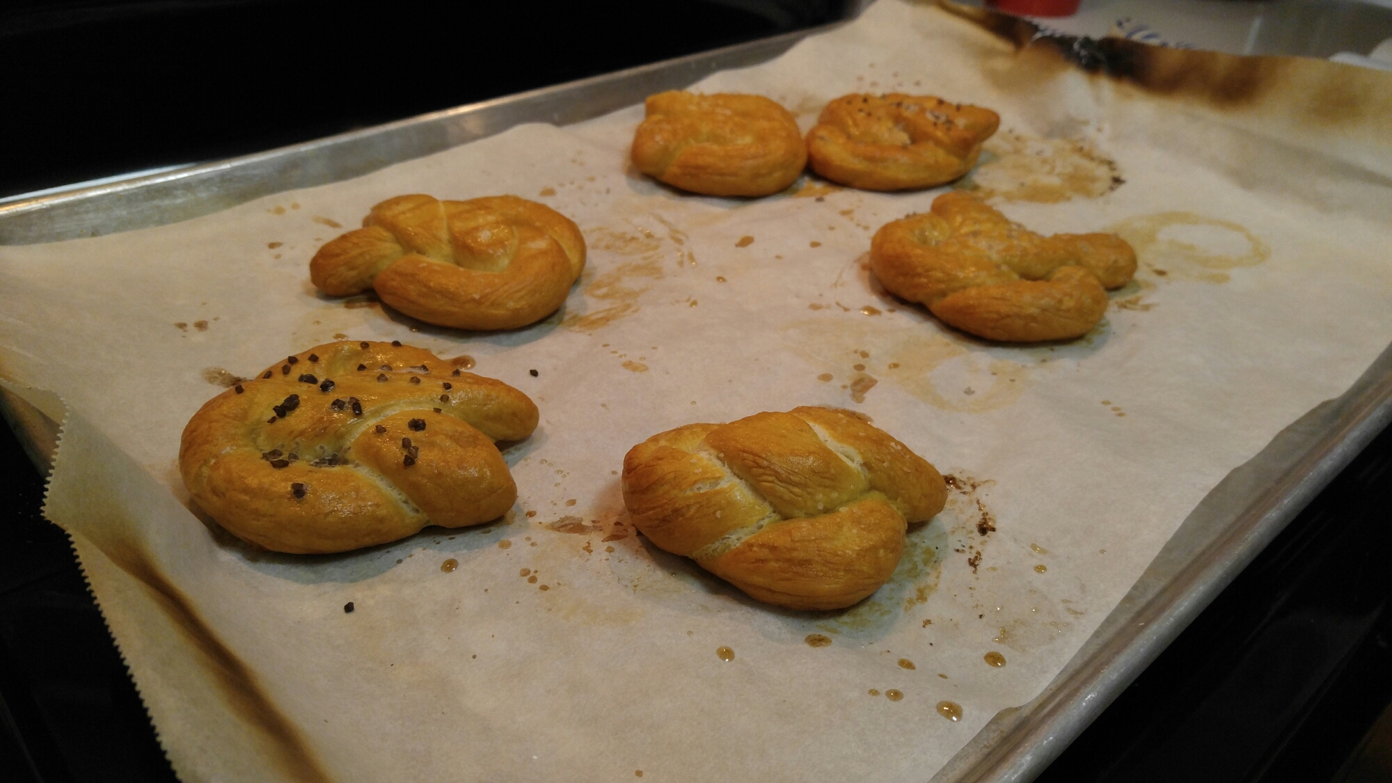Used the recipe from Joy of Cooking. They came out well for a quick-quick recipe. Garnished with various salts. They were really soft when they first came out of the oven. The next day the texture was closure to typical pretzel texture.