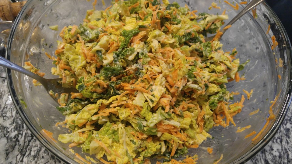 - Savoy cabbage lime and cilantro slaw to which I added shredded carrots and double the dressing. The slaw dressing was incredible!