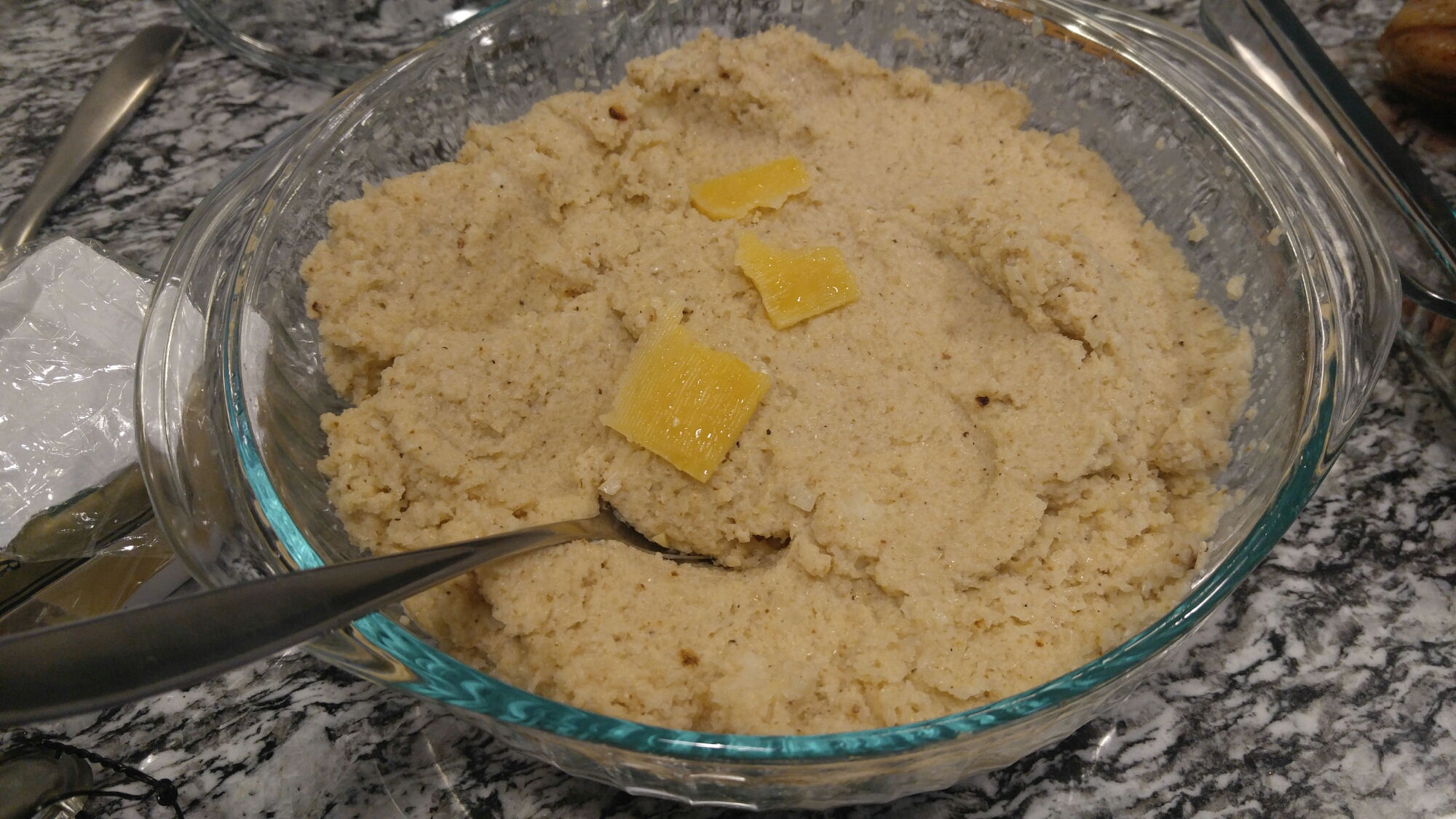 - Pan-fried and steamed cauliflower mash with Dubliner 2-year cheddar, heavy cream and butter. This recipe from “I breathe, I’m hungry” blog didn’t call for pan-frying or steaming, just zapping in the microwave so I improvised that. I food processed the cauliflower, but not to atomic level, just to cooked quinoa sized bits level. It actually came out tasting like quinoa or grain because of the texture and because I did not cook it to sog, think “al dente”.