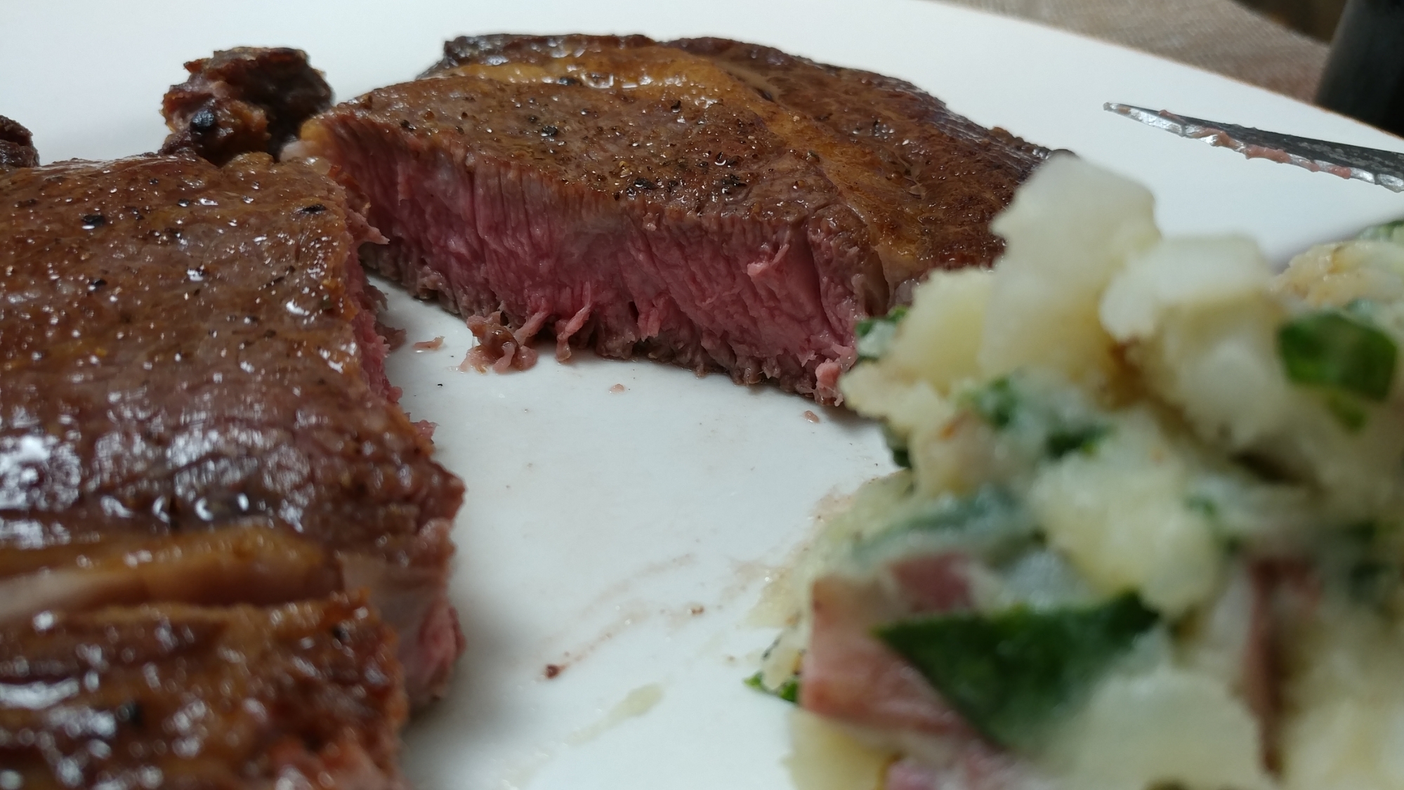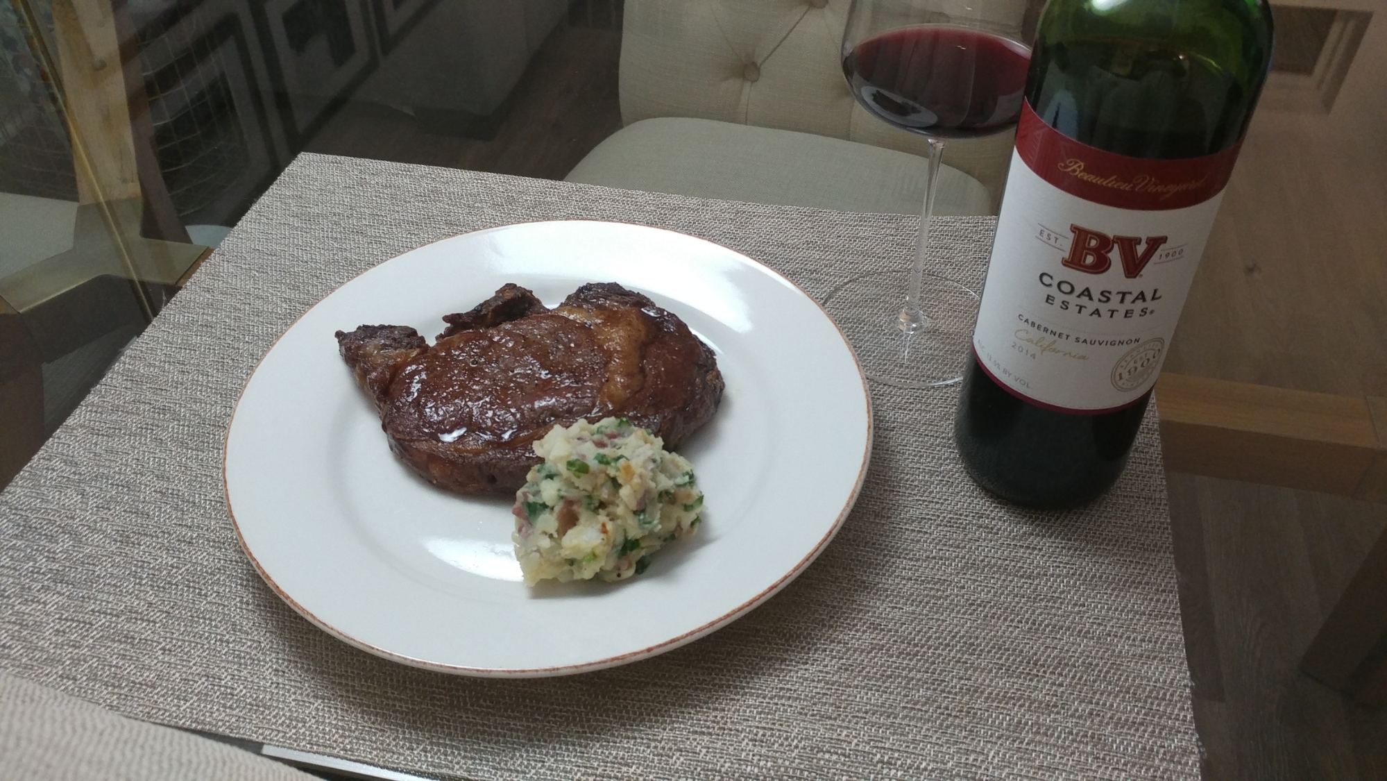 Dry aged Angus steak was tasty. I prepared it using my usual techniques. The potatoes I cubed, boiled, drained and mixed in sauteed shallots, butter and baby spinach. Delicious.