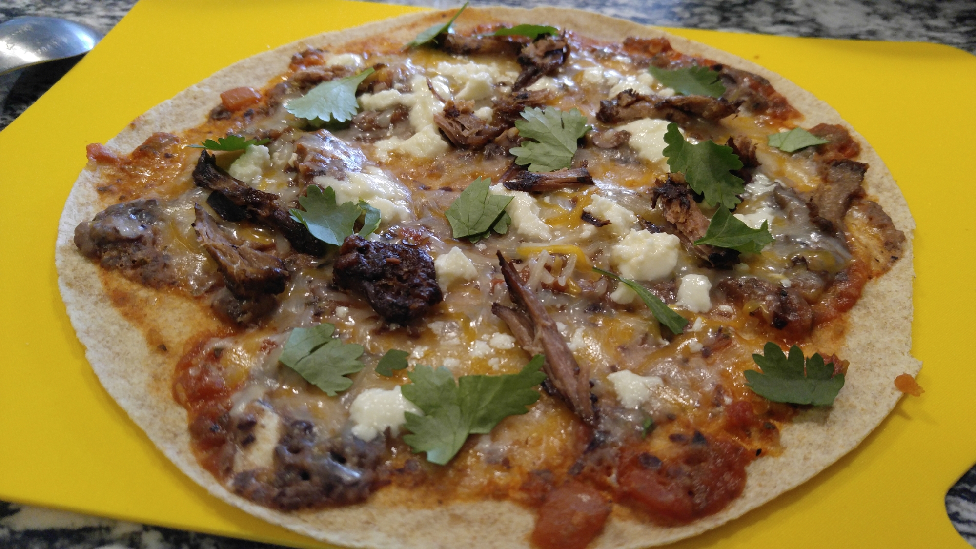 I had a surplus of tortillas and other ingredients and made faux pizzas using salsa as the base sauce, refried beans layer, mixed taco cheese, queso fresco cheese, pulled beef and shredded fresh cilantro.