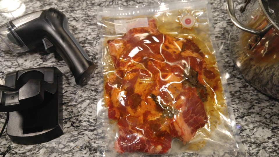 I picked up new equipment to be able to sous vide including this vacuum gun. After the holidays, the supermarkets always have an exodus of great meat on sale so I picked up this Angus Chuck to make pulled beef out of. I seasoned it with spices and also dried ancho peppers (dried poblano peppers). I had it sous viding for 3 days at 155°.