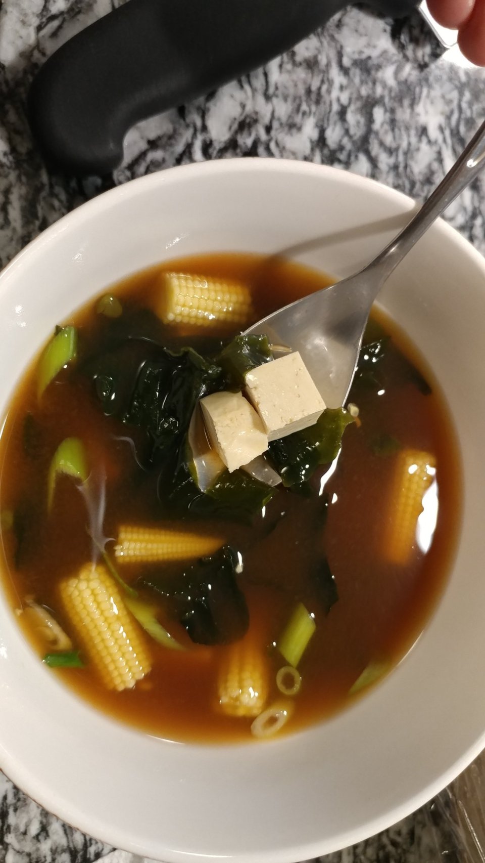 Dilute the vegetable paste and combine with clam juice in a pot over low heat. Do not bring to a boil. Stir in the seafood flakes and miso. Add the corn, green onion and tofu. Stir. Don’t forget to add shitake mushrooms!