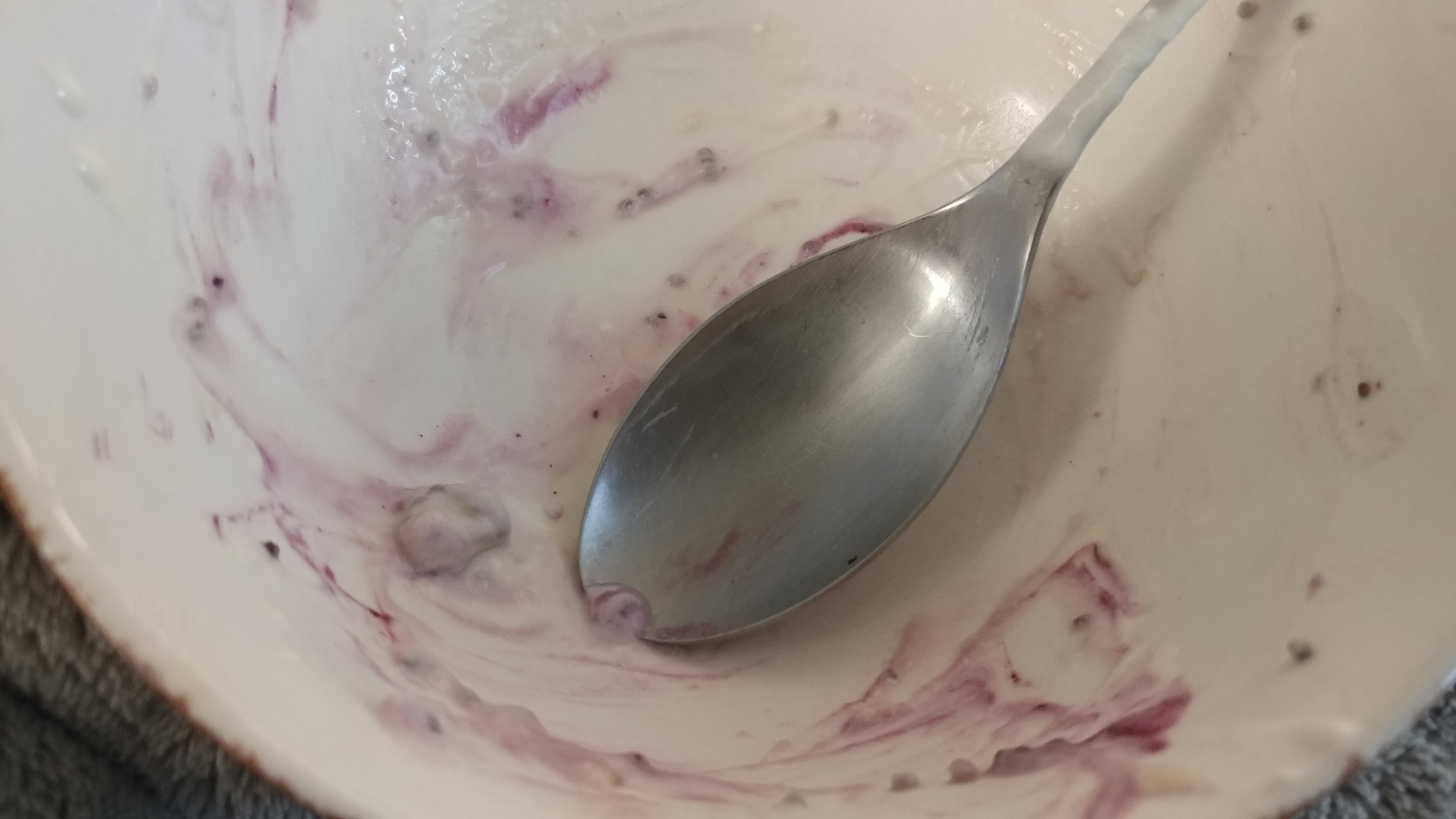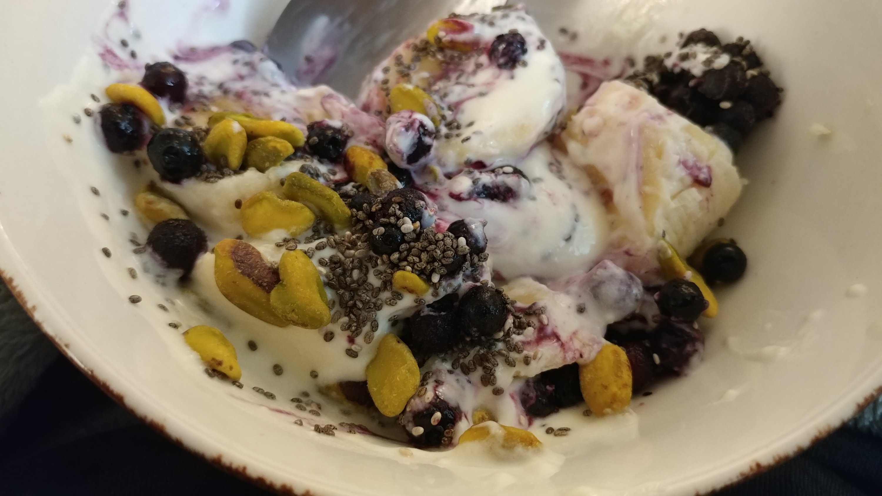 Seven Stars Farm plain yogurt, sliced banana, frozen wild blueberries, chia seeds, and pistachio nuts! Yummm…and I don’t even feel guilty eating this!