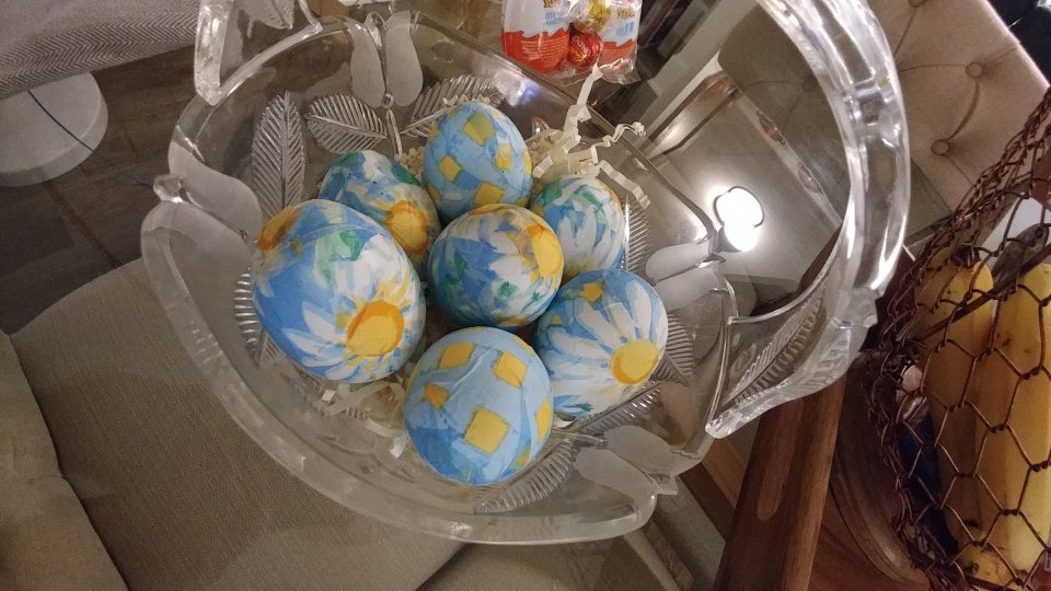 My mom brought these beautiful eggs. She used a technique with egg white wash and tissue paper to create such a cute daisy design!