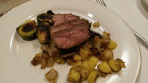 Steak; grass fed filet and strip. Seared and roasted. Brussel sprouts; halved and pan fried. Potatoes; baby yukons, quartered, roasted and pan fried. Mushrooms & onions; baby bellas and sweet, chopped and fried.